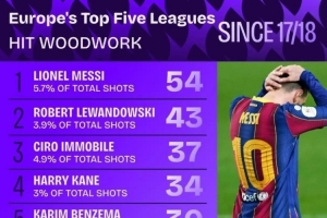 2017-18赛季以来五大联赛球员射门中柱次数:梅西领跑,莱万第二