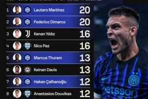 本赛季意甲参与进球榜:劳塔罗20球居首,前五中国米球员占据三席