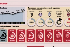 意甲联赛外籍球员比例从2017-2018赛季的55.2%升至本赛季的69.1%,主流联赛中外籍球员比例仅低于英超(75.4%)、葡超(73.8%)。
